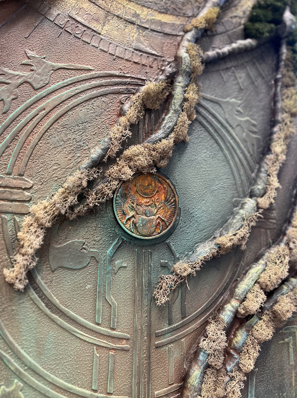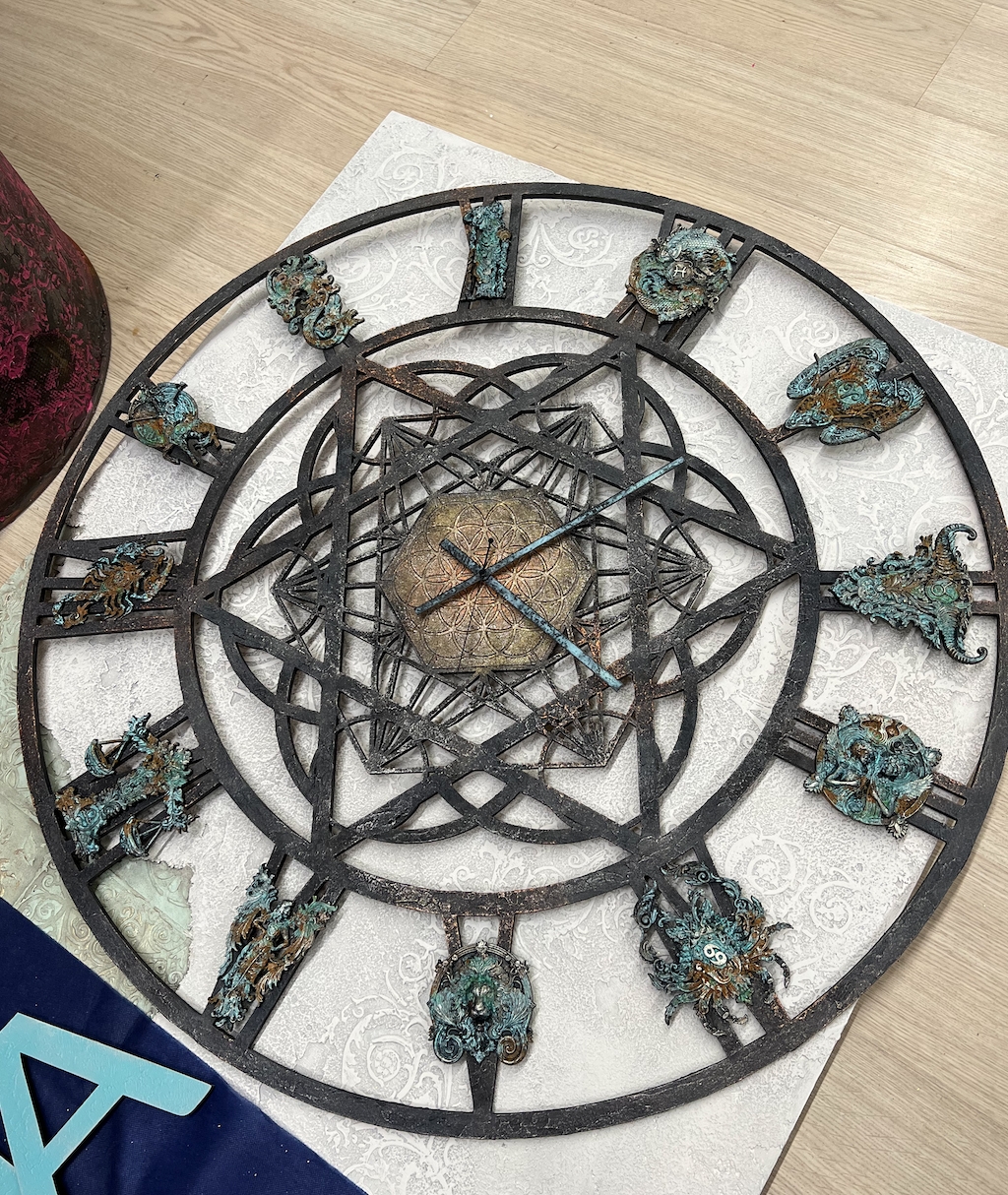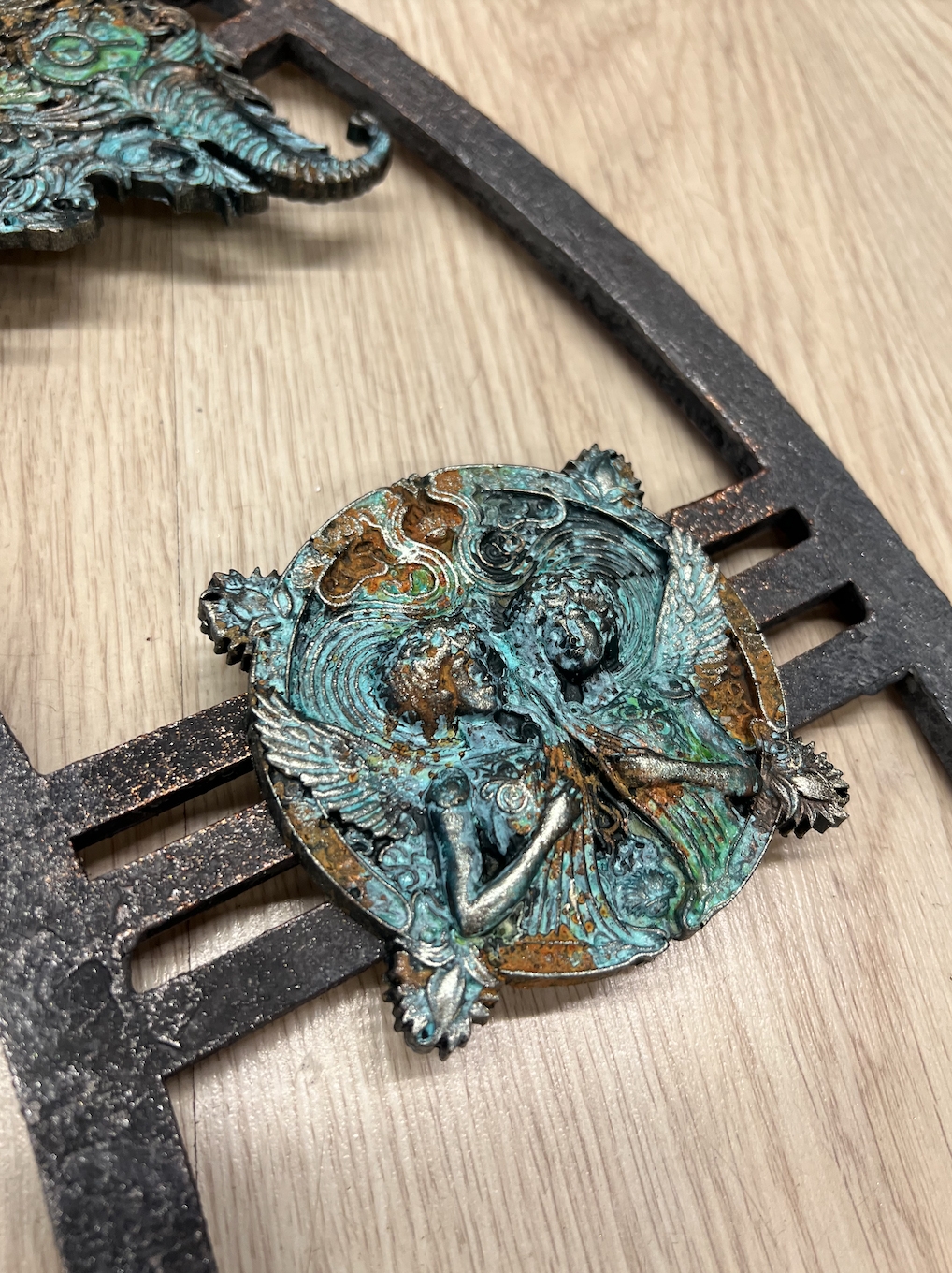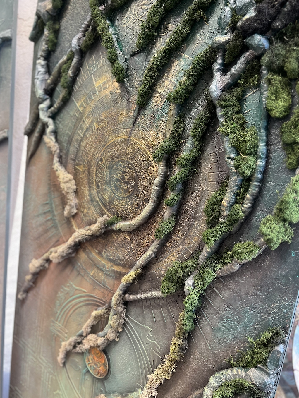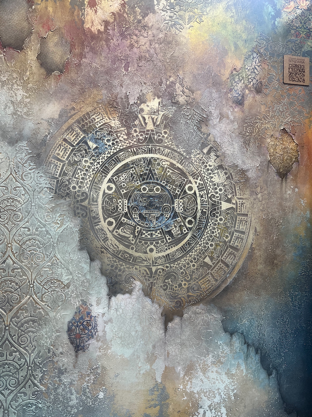 В работе постарались сочетать восточный и западный орнамент, добавили немного противостояний по цвету, эпохам и стилям, соединив их в пульсирующей мандале майянского календаря. Главный подход к работе - это разрыв указанных в битве шаблонов: восточный колорит цветов и переливов, смелые яркие акценты стали подложкой для классических и западных орнаментов, а западный приглушённый натуральный эко стиль вписался, как величественный и белоснежный Тадж-Махал в изящные оттиски восточного орнамента, где лишь намёком просачивается золотистая патина.