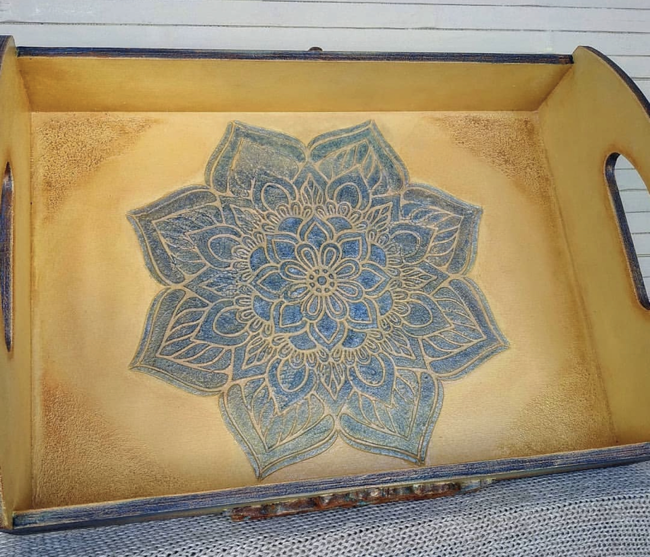 Мандала даёт тонкий контурный рисунок и при нанесении пасты смотрится, как вогнутое кружево. Особенно эффектно смотрится с поталью и металлизированными красками.